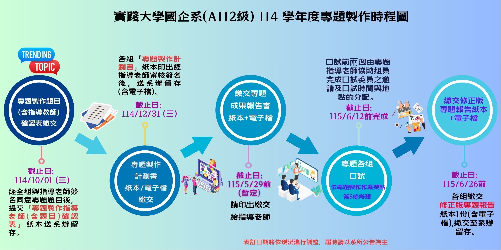 - 專題口試時間擬定於115/06/01(一)~115/6/12(五)前完成。