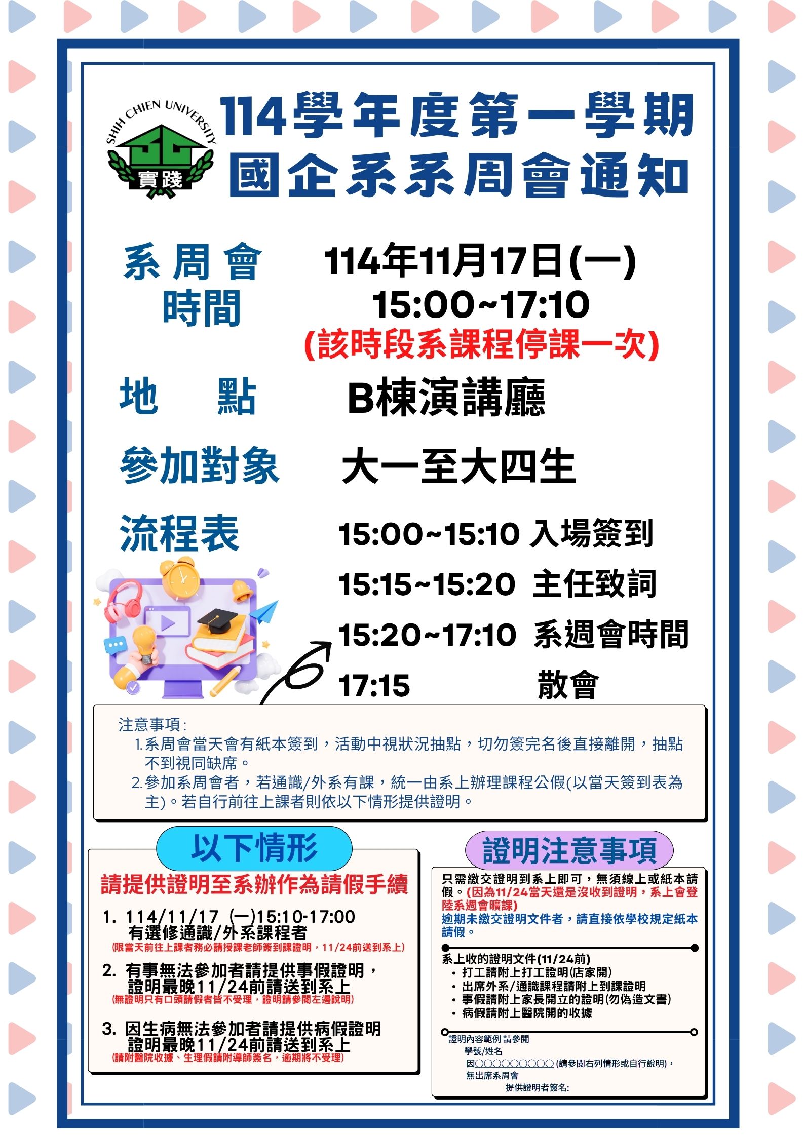 114-1國企系系周會11/17(一) 15:00~1715 演講廳